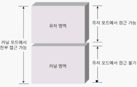 OS의 실행에 필요한 내용에 접근 중일때는 커널 모드로 커널 영역의 내용을 접근하며 실행함.