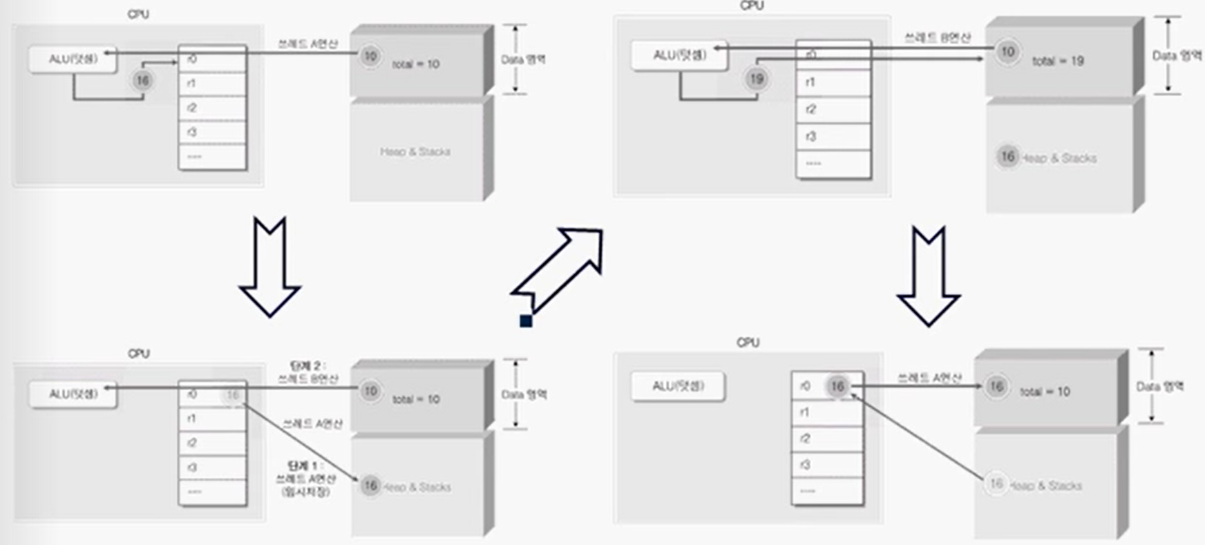 total이라는 변수 문제가 아님. total에 접근하는 코드가 문제가 됨. 이런 코드 블럭을 임계 영역이라함.