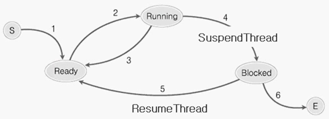 또 Blocked 상태의 쓰레드를 다시 Ready 상태로 돌이키는 함수가 ResumeThread() 함수.