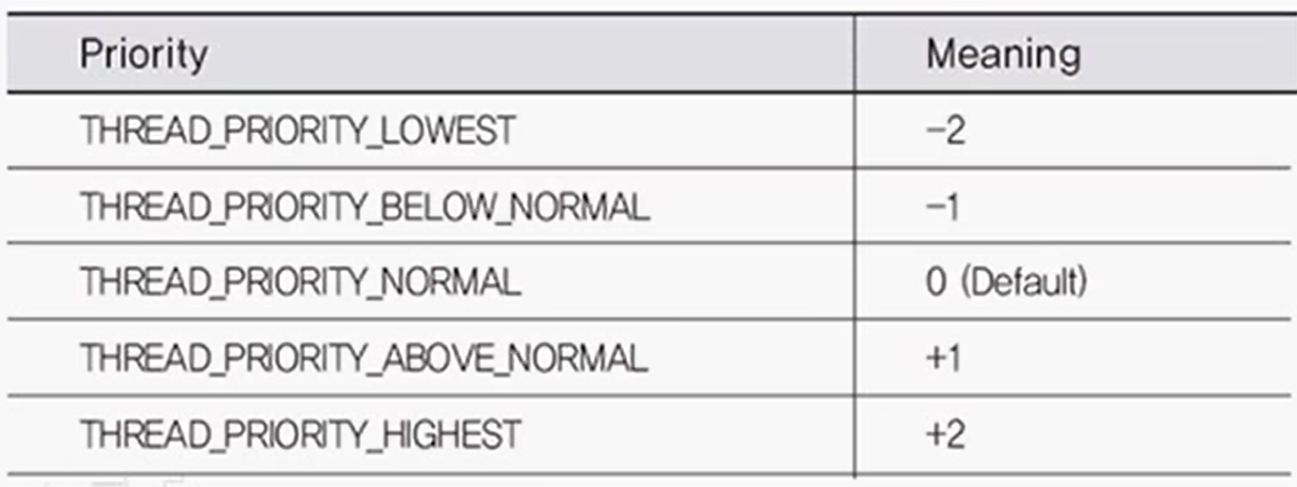 Note) SetThreadPriority() and GetThreadPriority()를 통해서 쓰레드의 우선순위를 접근할 수 있음.