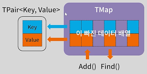 - 비어있는 요소가 있을 수 있고, TMultiMap을 사용하면 중복 데이터도 관리할 수 있음.