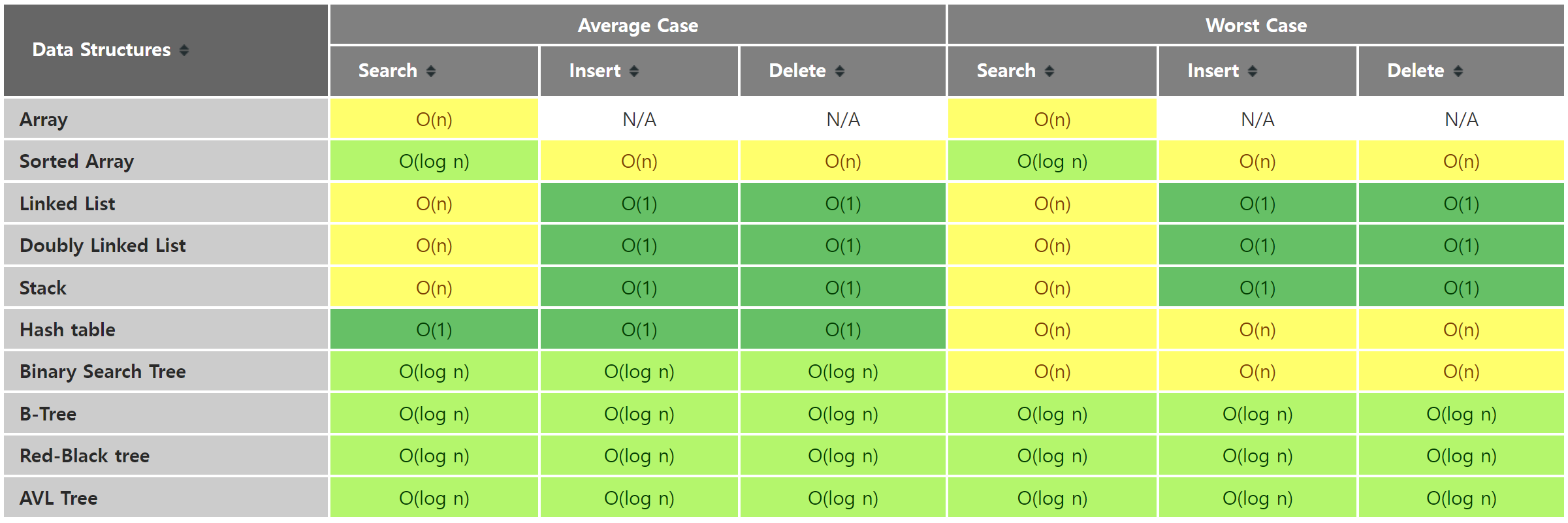 Note) 대표적인 자료구조들의 시간 복잡도 테이블