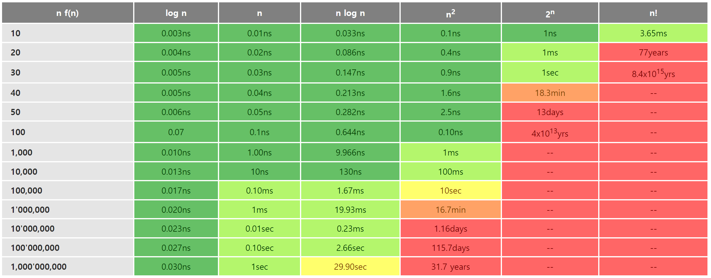 Note) 빅오 표기법별 데이터의 개수에 따른 연산 횟수 테이블